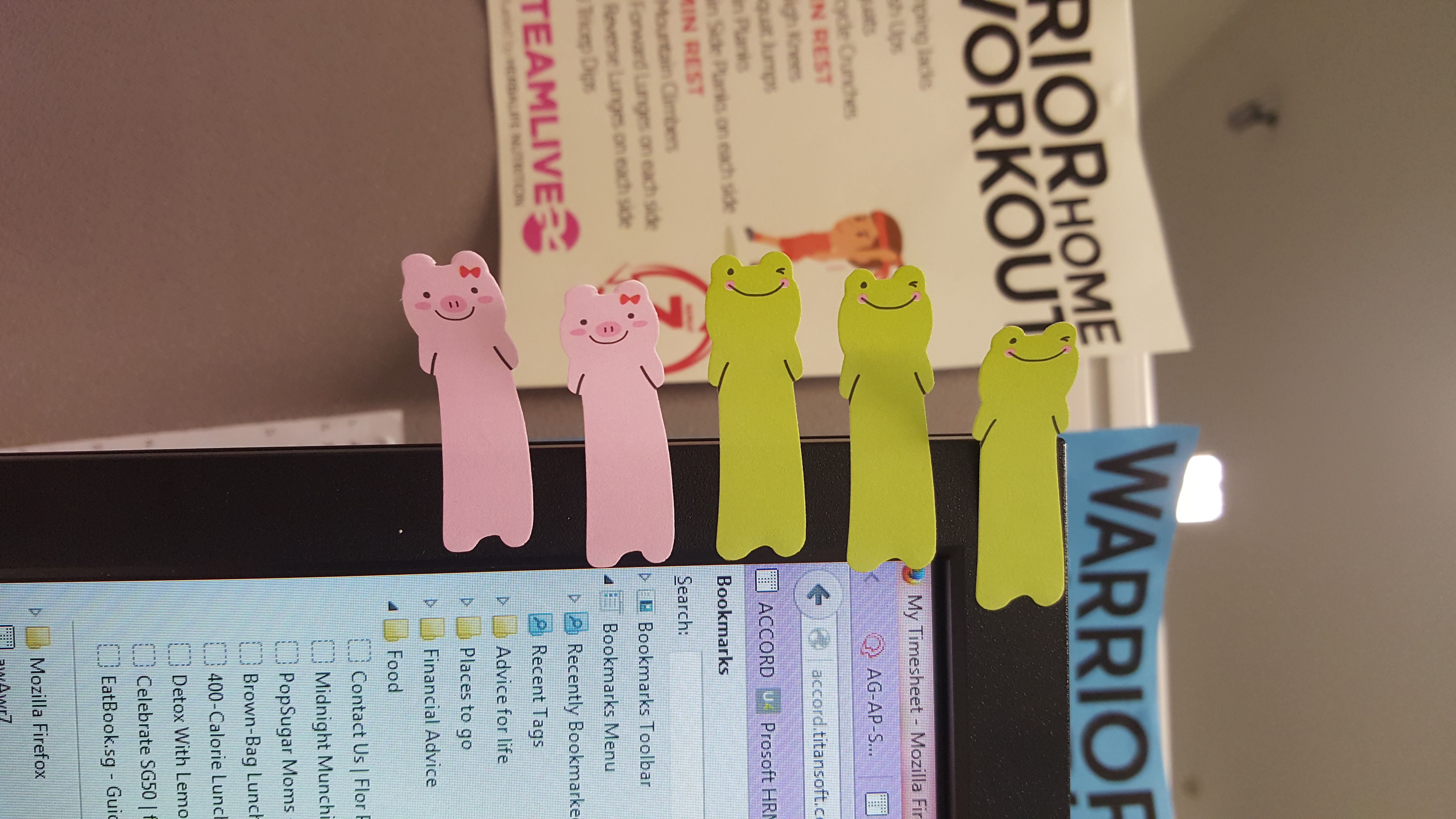 The green tab represents a healthy snack (below 100 calories) while the pink tab represents an unhealthy snack (crackers, sugar peanuts). Every time I snack, I will remove one tab so that I know how many remaining times I can snack, and on what types of snack I can have.