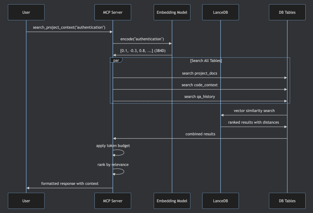 The workflow fits naturally into how our teams already operate. During sprint work, a developer uses Cursor or Claude Code with the Atlassian MCP to pull in Jira stories and Confluence documentation. They review the project codebase, summarize the important context, and use the Local RAG MCP to embed and store it as vectors. The next time a similar question comes up — in the same session or weeks later, in a completely different tool — the RAG MCP retrieves the nearest vectors and feeds them as context.