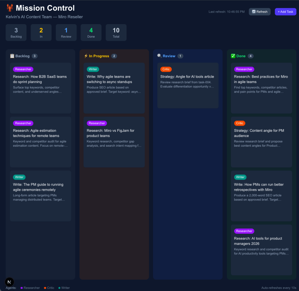 My agent setup works the same way. I built a Mission Control dashboard with four columns: Backlog, In Progress, Review, and Done. When I drop a task into Backlog, the Researcher agent pulls it when ready, does the work, and moves it forward. No manual assignment. No “hey can you start on this?” The work flows because the system is designed to pull it through.