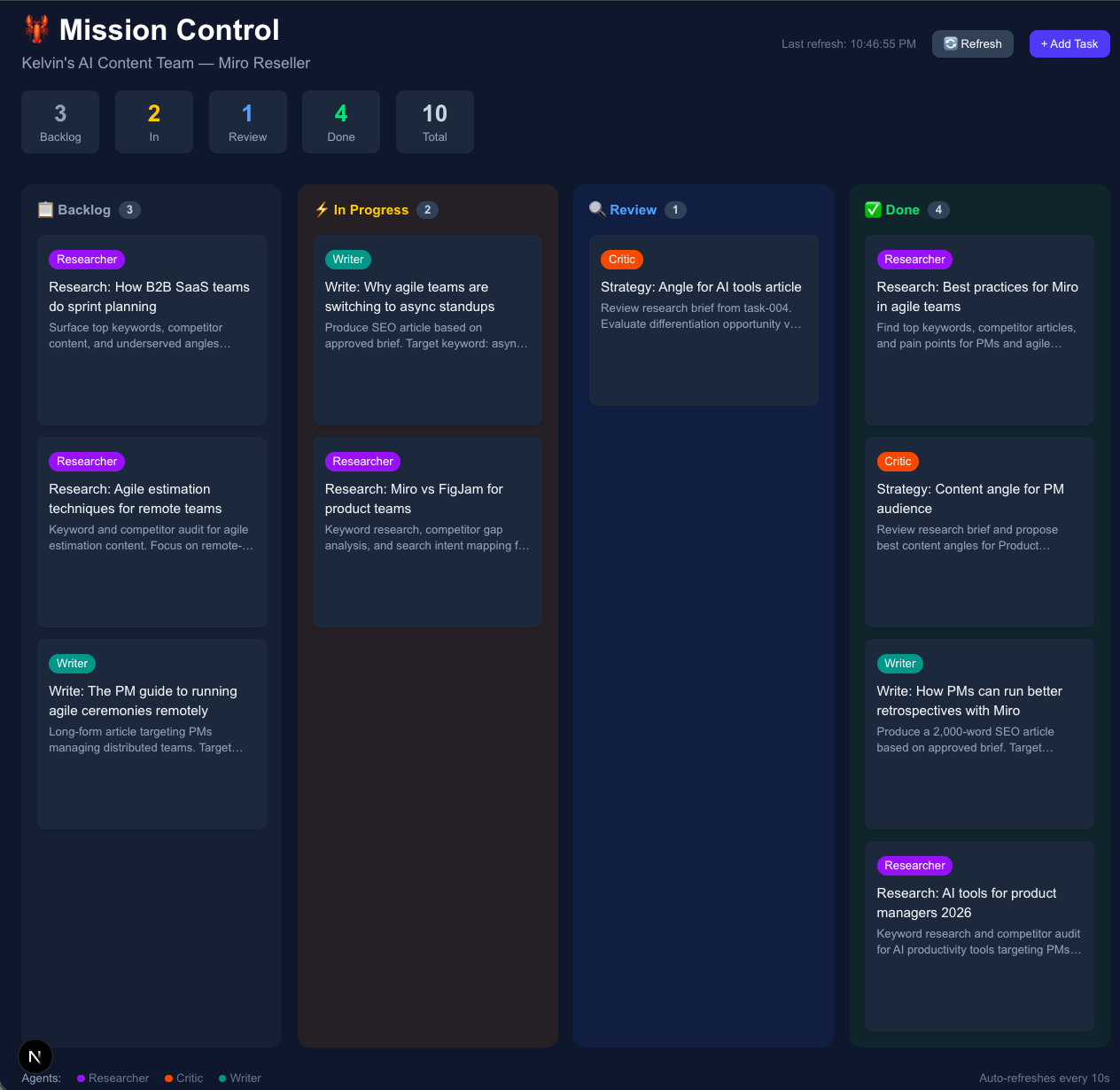 “Create a mission control dashboard in Next.js with a kanban-style taskboard. It should update in real-time and serve as the main hub where agents check for available tasks. Include columns for Backlog, In Progress, Review, and Done. Add colour-coded agent badges: Researcher in purple, Critic in orange, Writer in teal. Hovering a task should let me move it between columns, assign it, or delete it.”